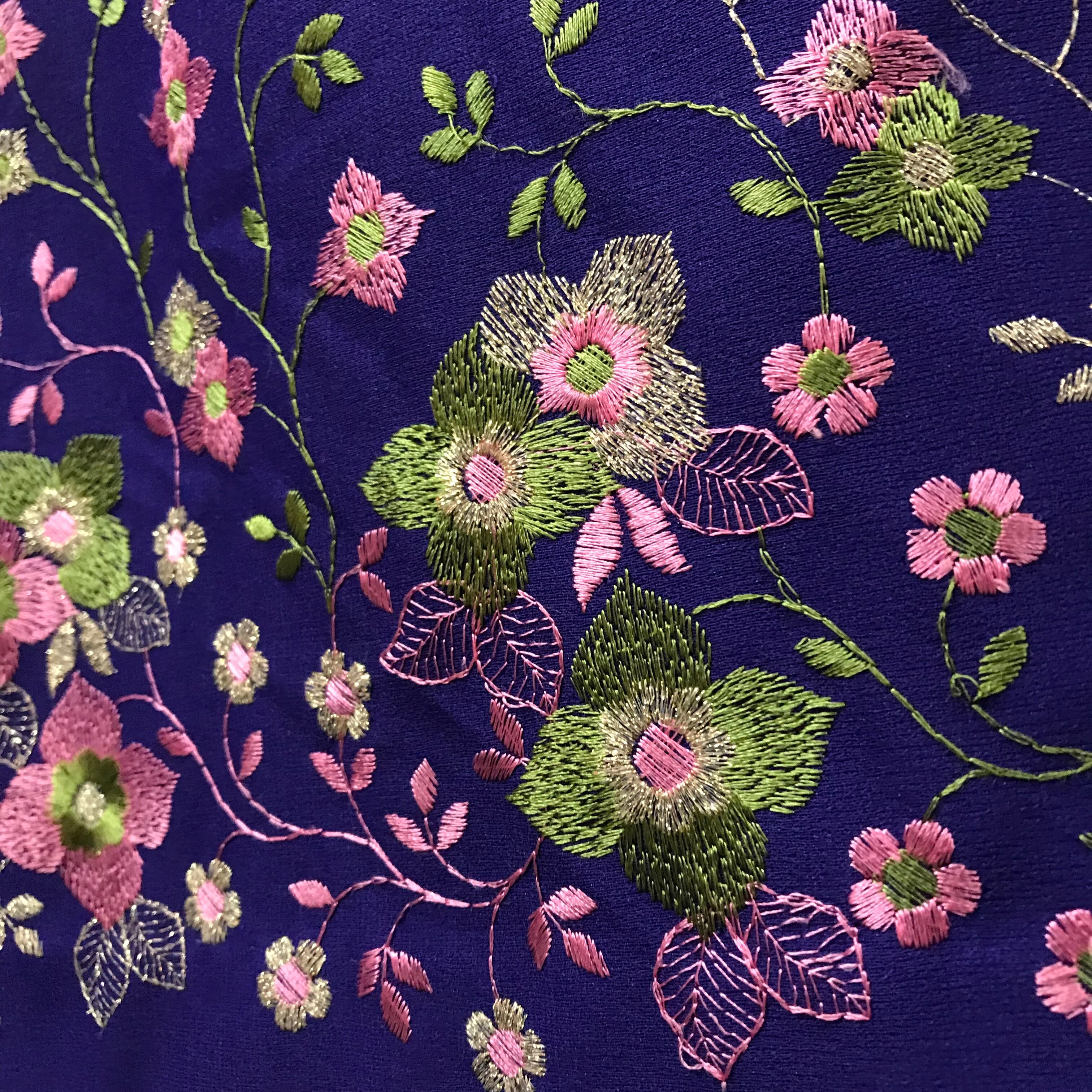 パープルのマキシスカートのスソに映えるピンク×グリーンの花柄刺繍