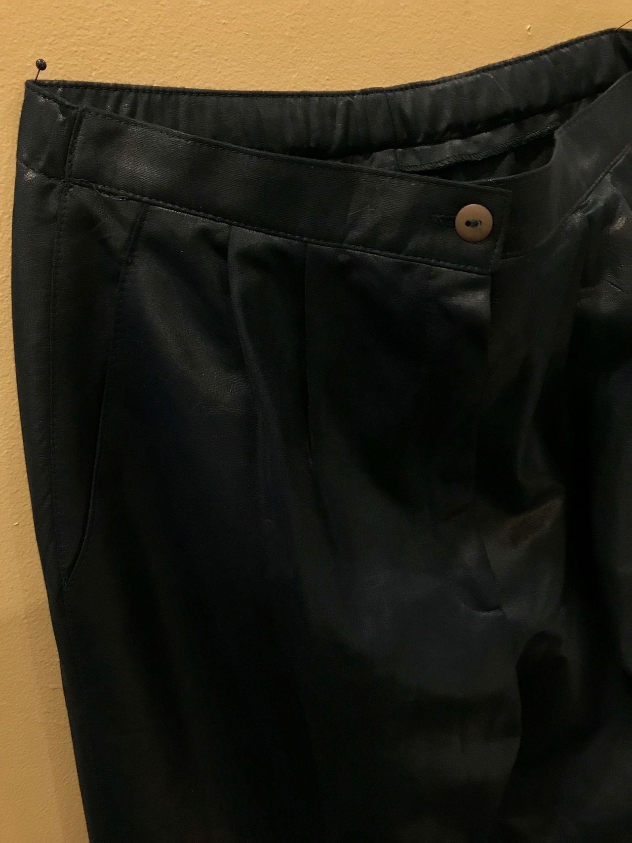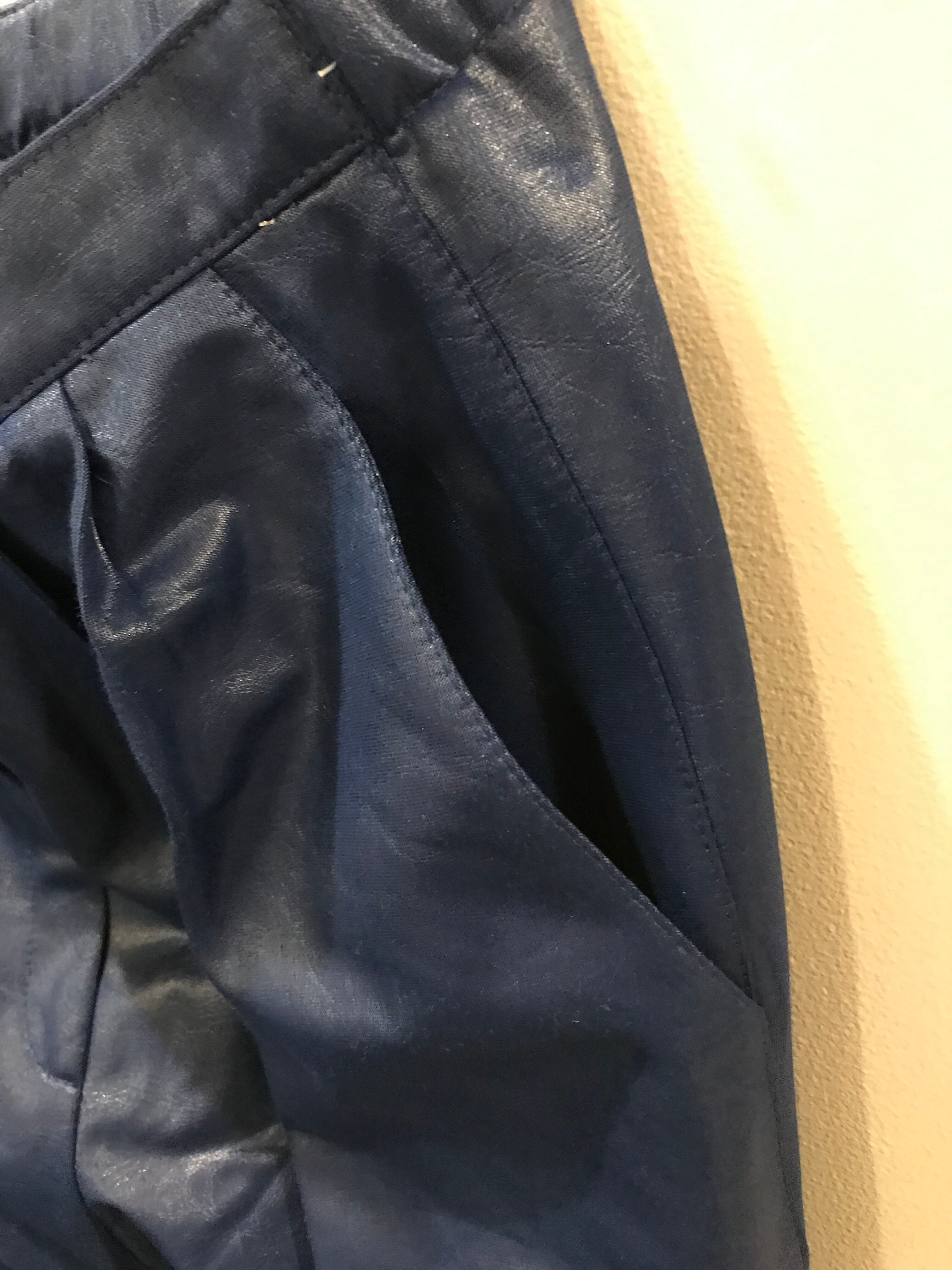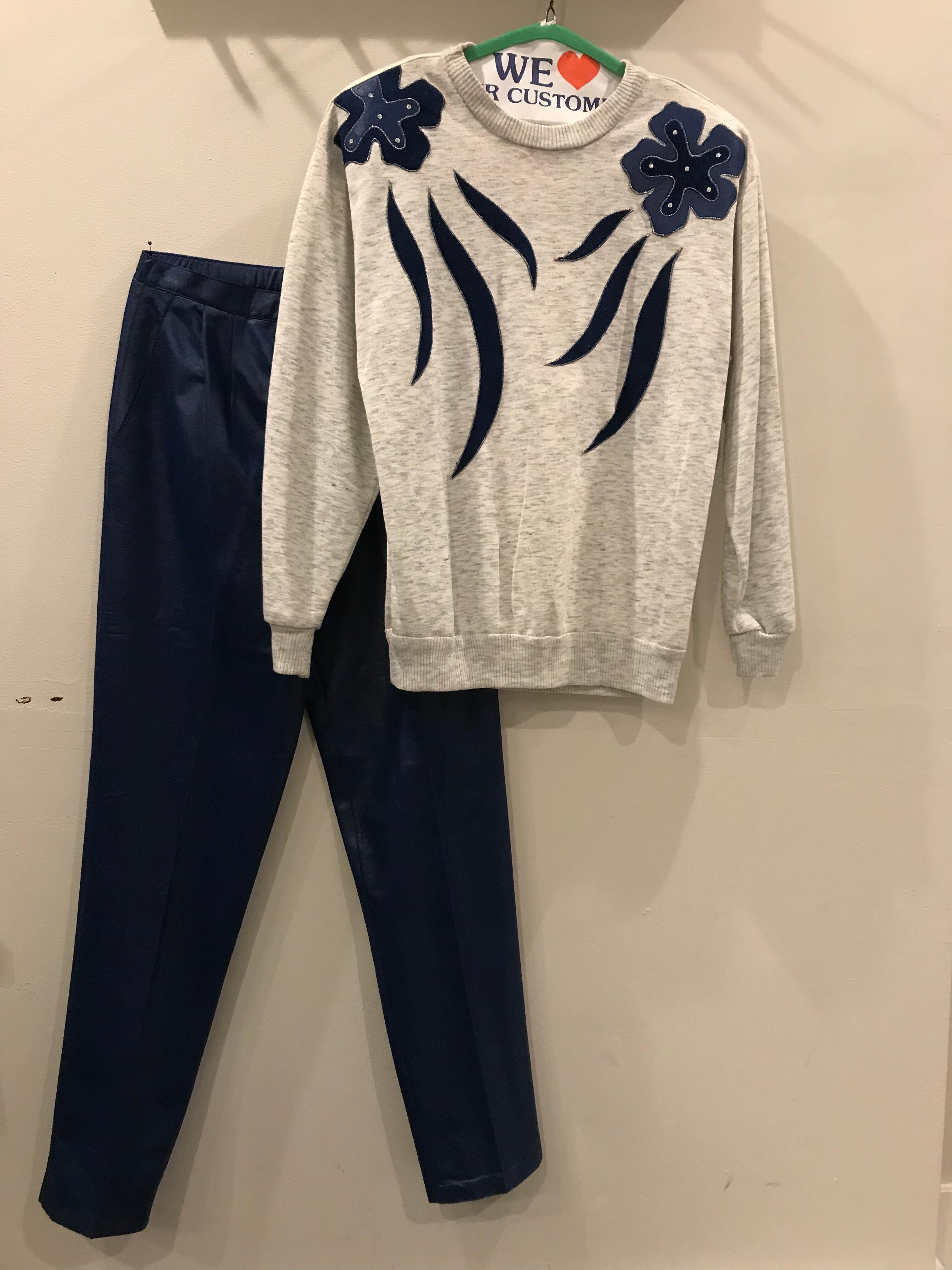 スゥェットトップスとシャイニーなパンツのセットアップ