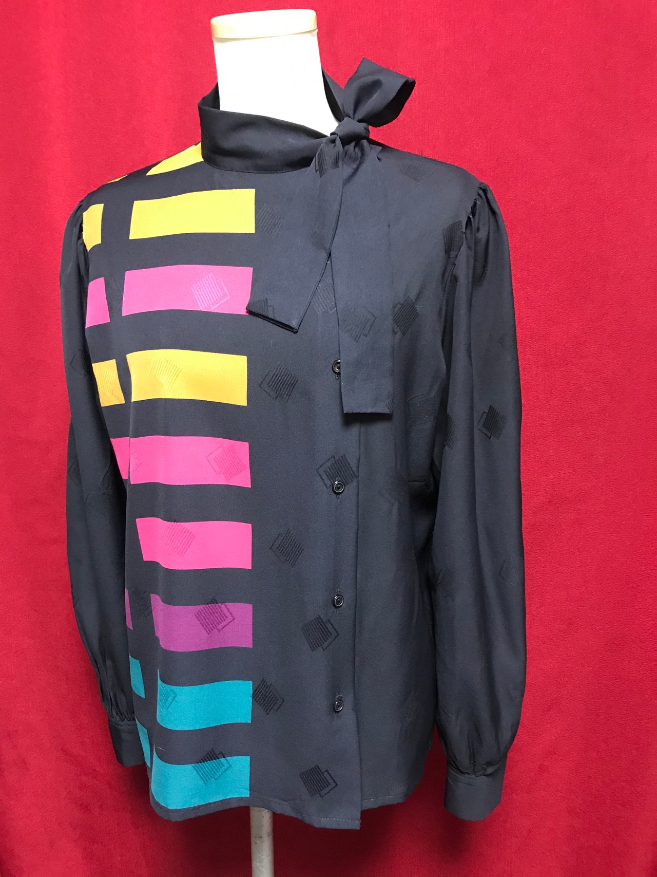 ブラック×モダンカラーブロック タイカラーブラウス