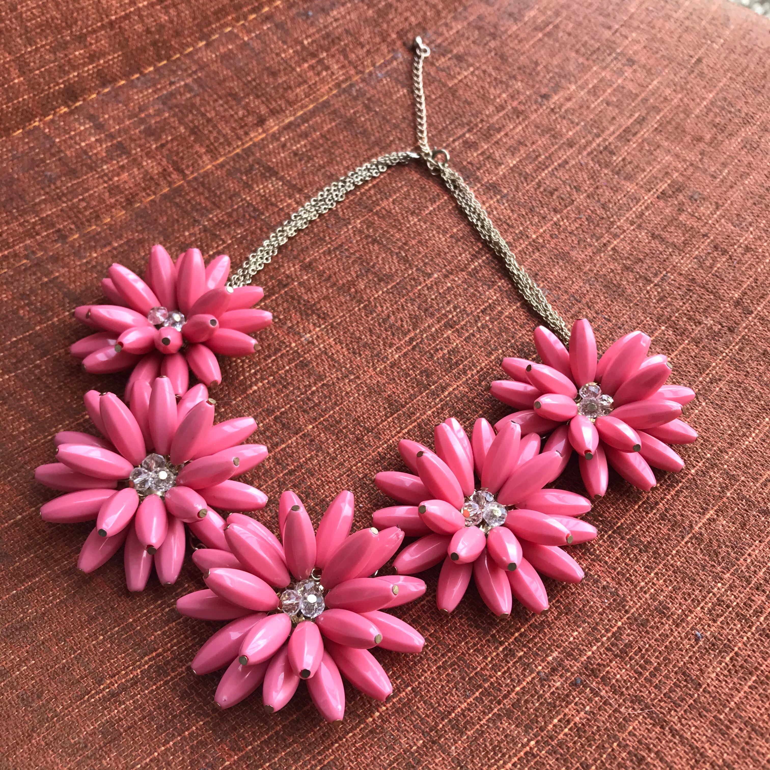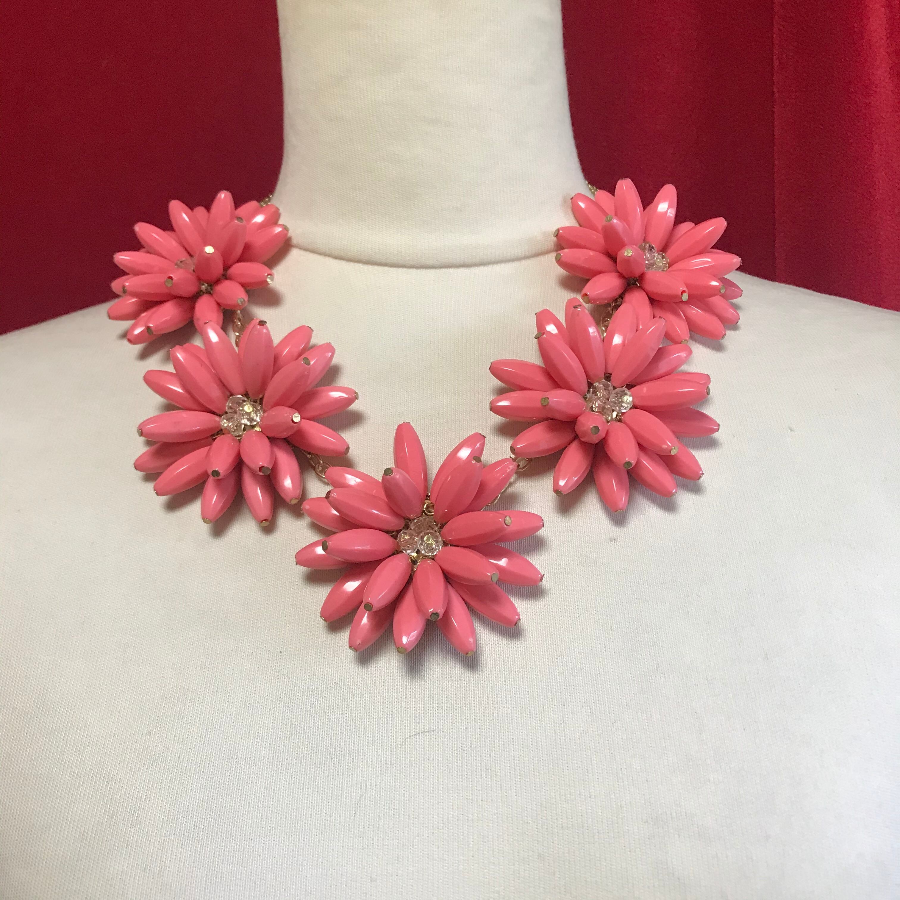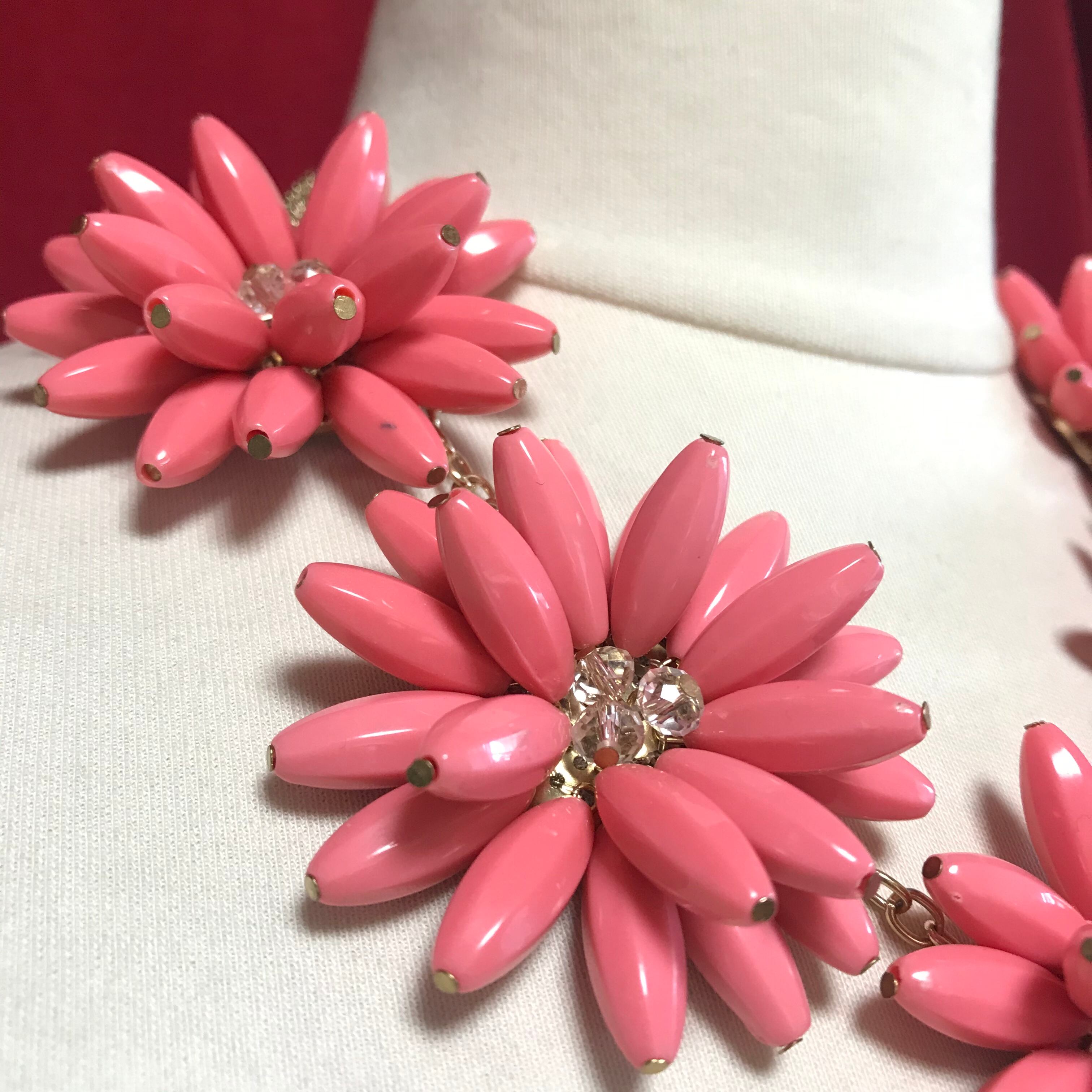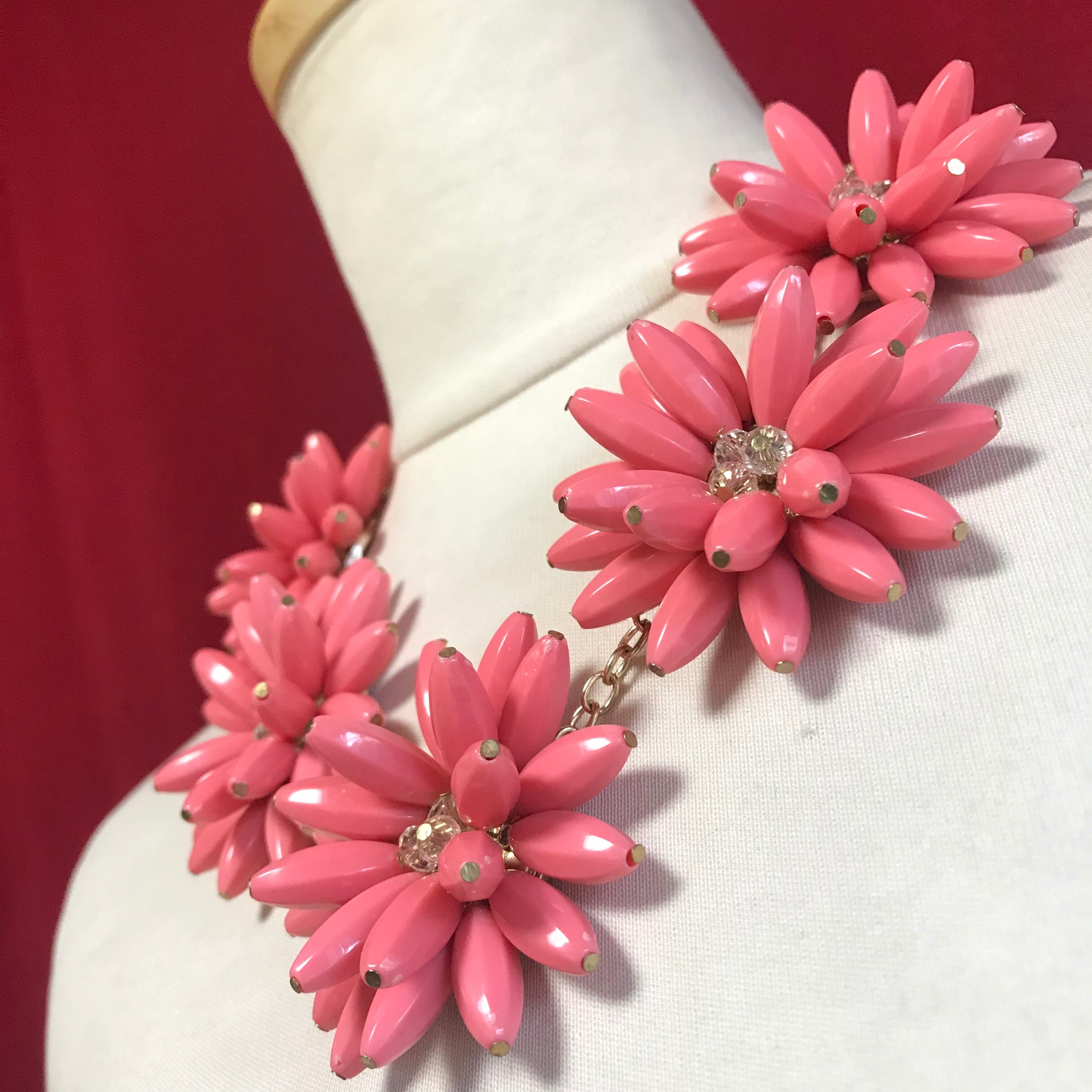 サーモンピンクのフラワーモチーフが5つ連なったネックレスです