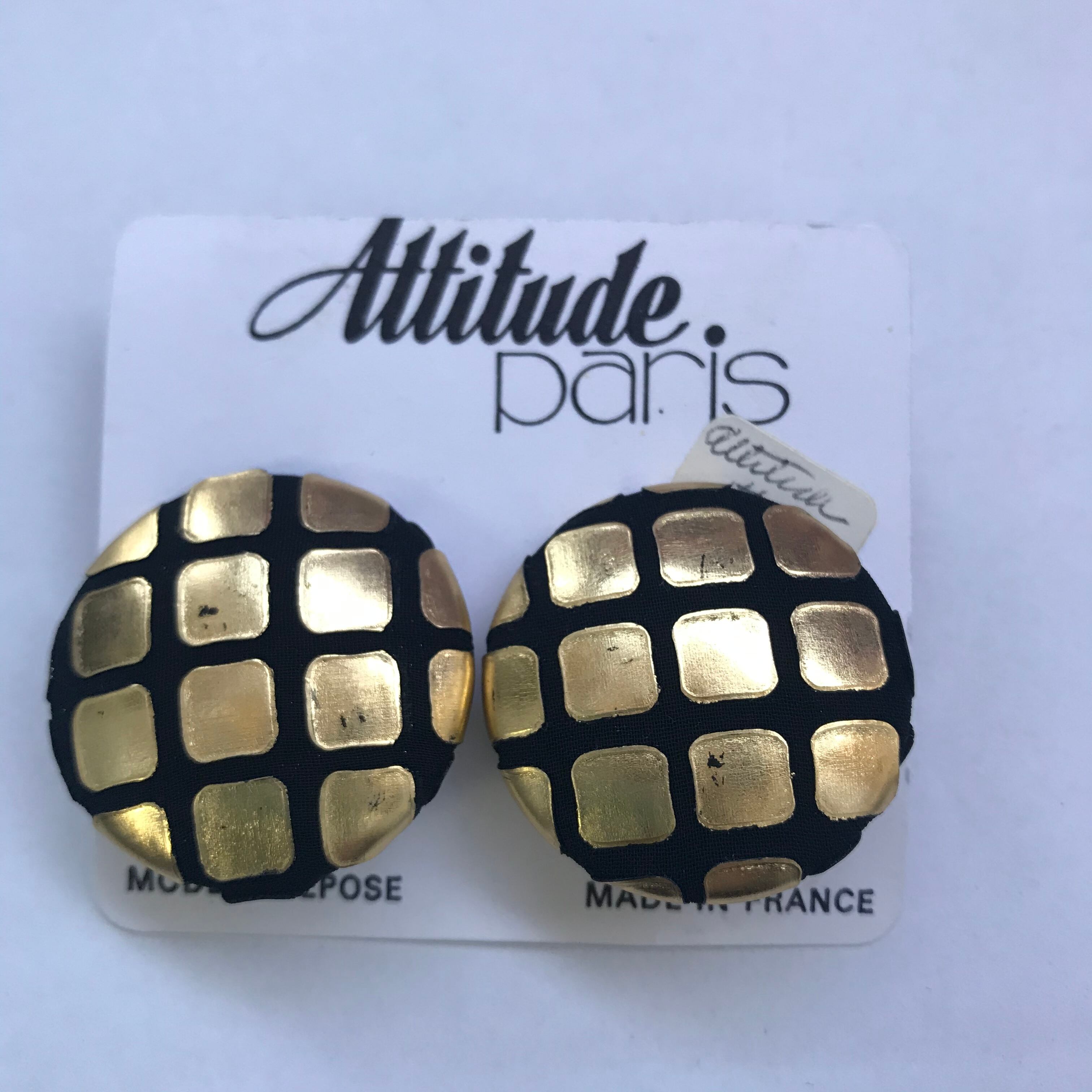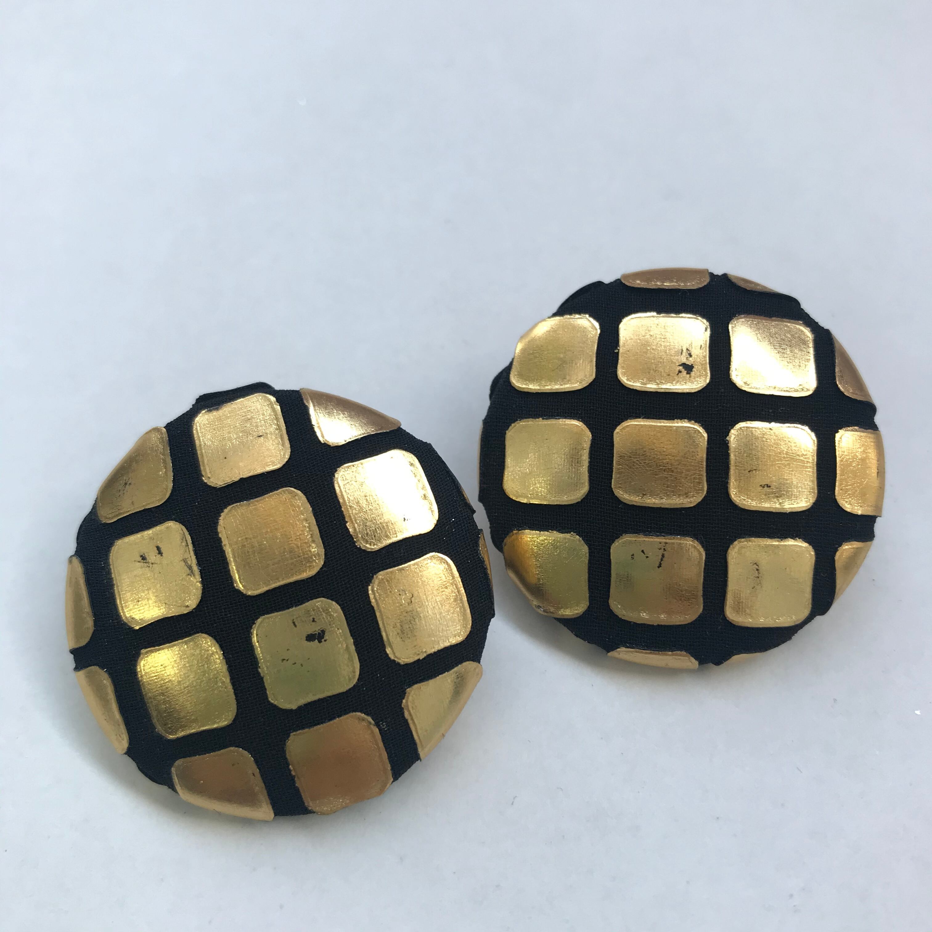 ブラック生地にブロックチェックのゴールドグリッター泊プリントイヤリング