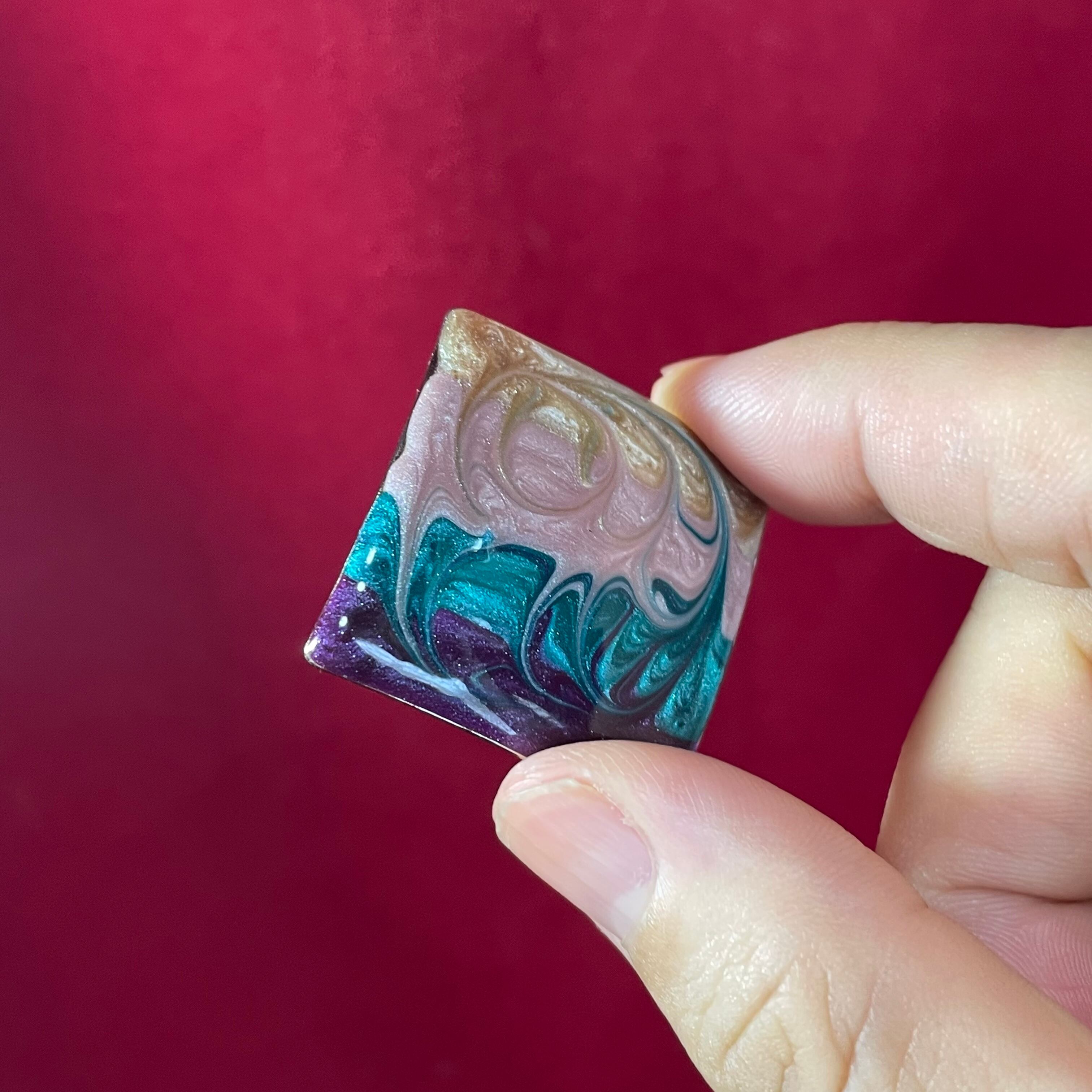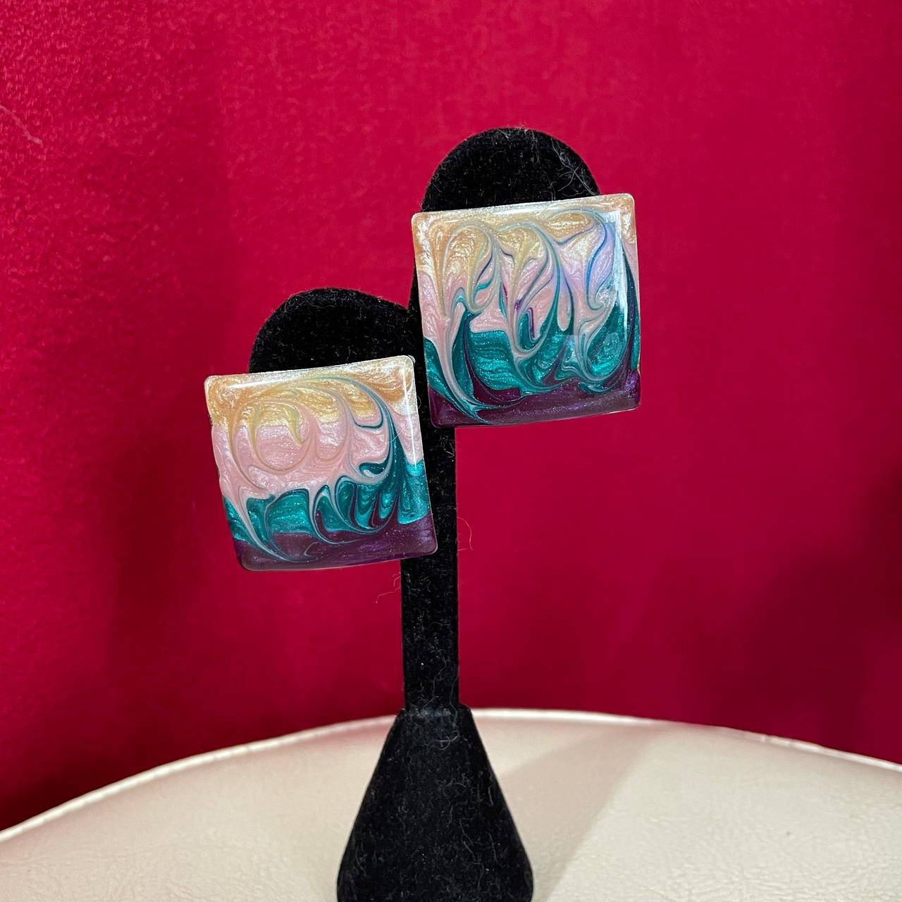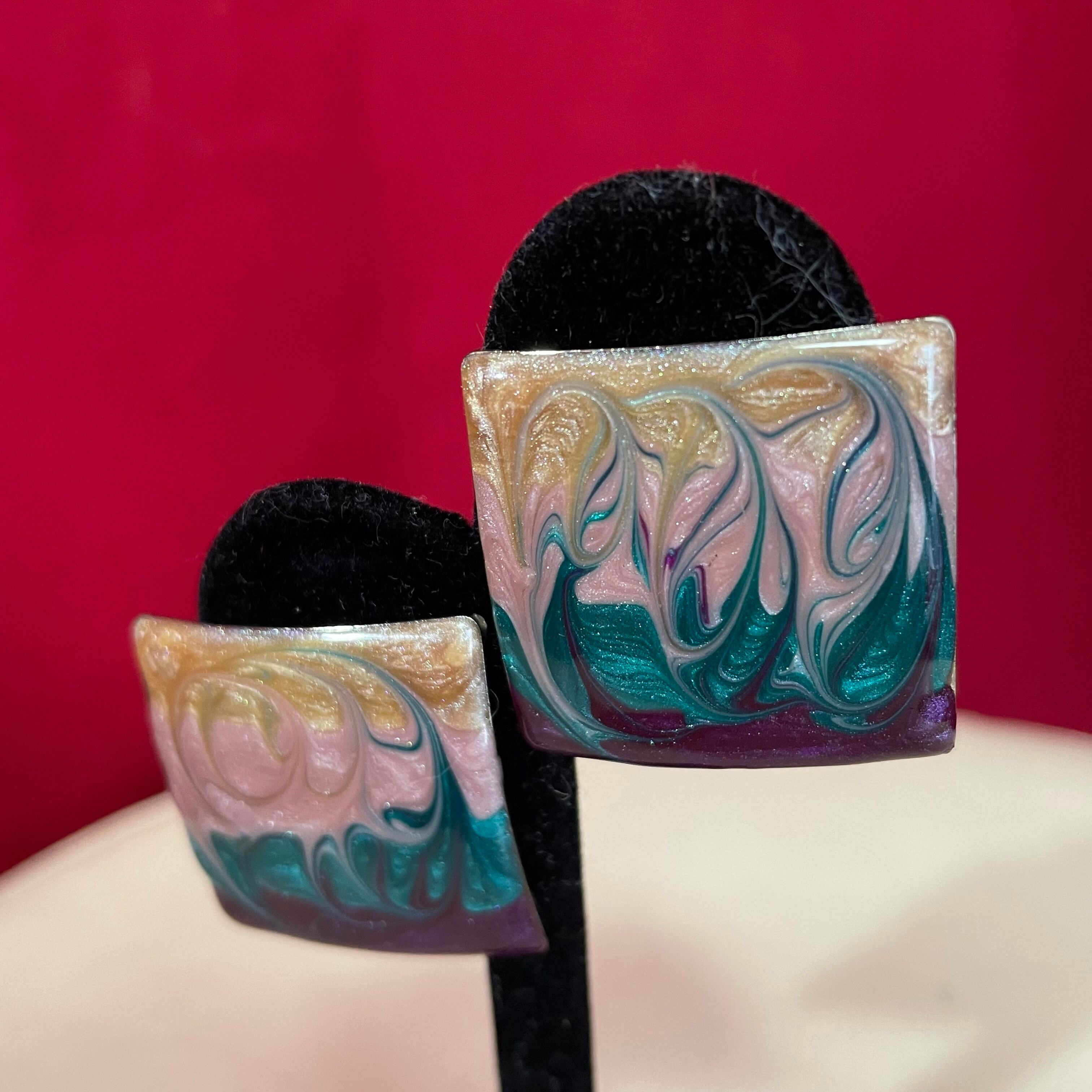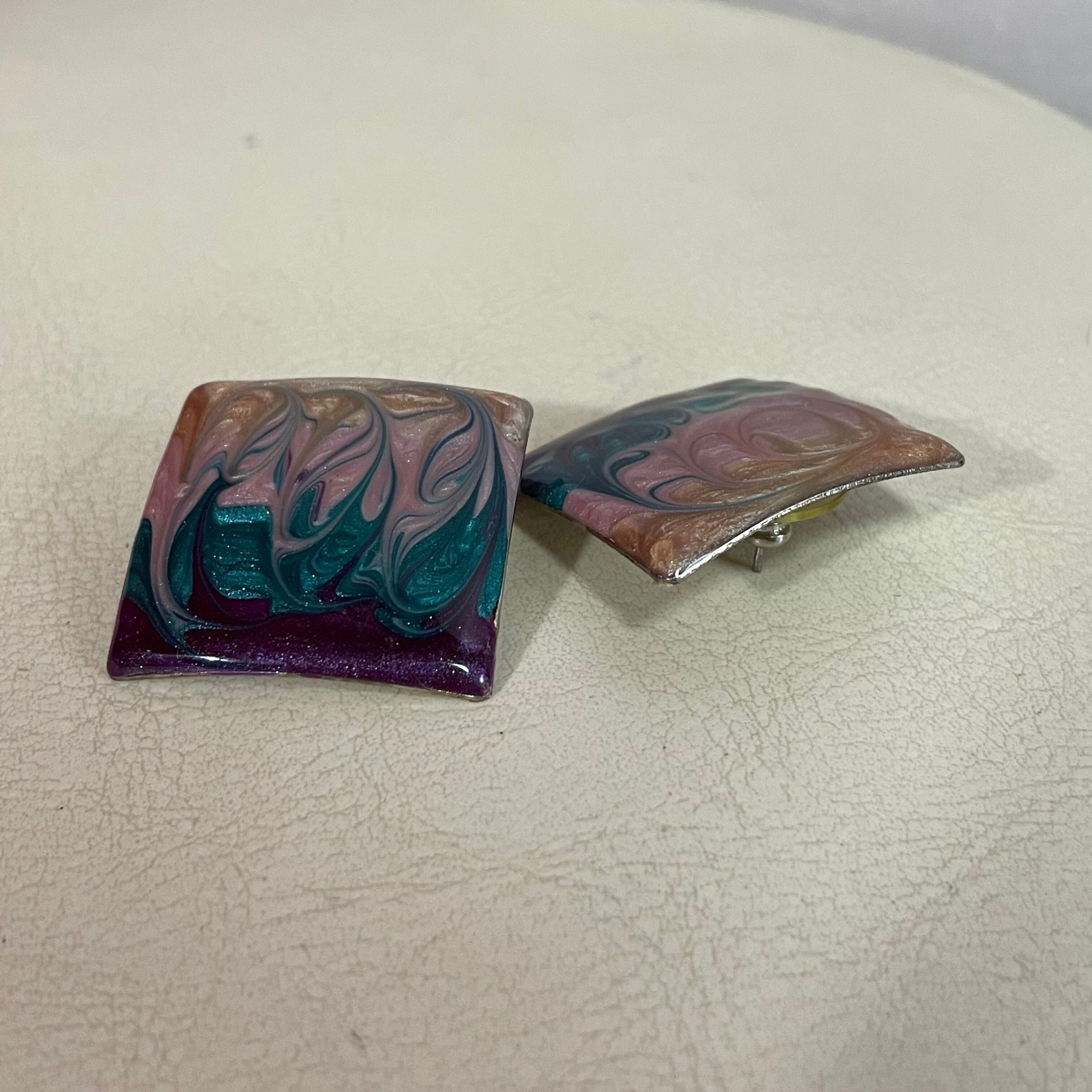 パールカラーのパープル、グリーン、ピンクのマーブリングのエナメルピアスです