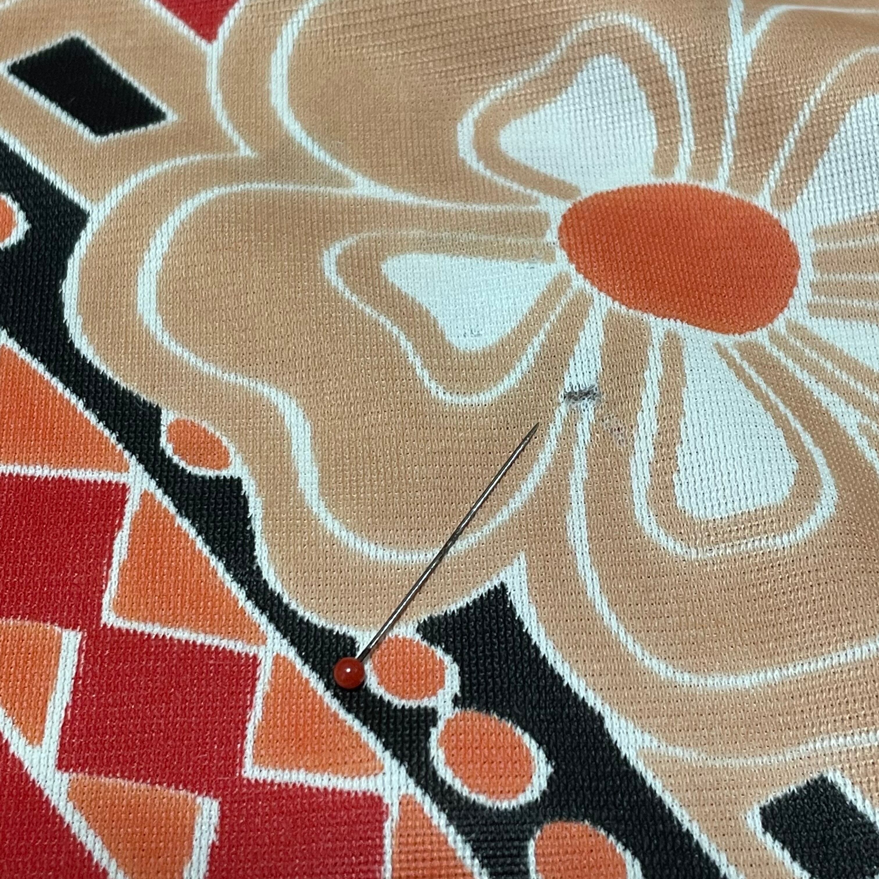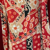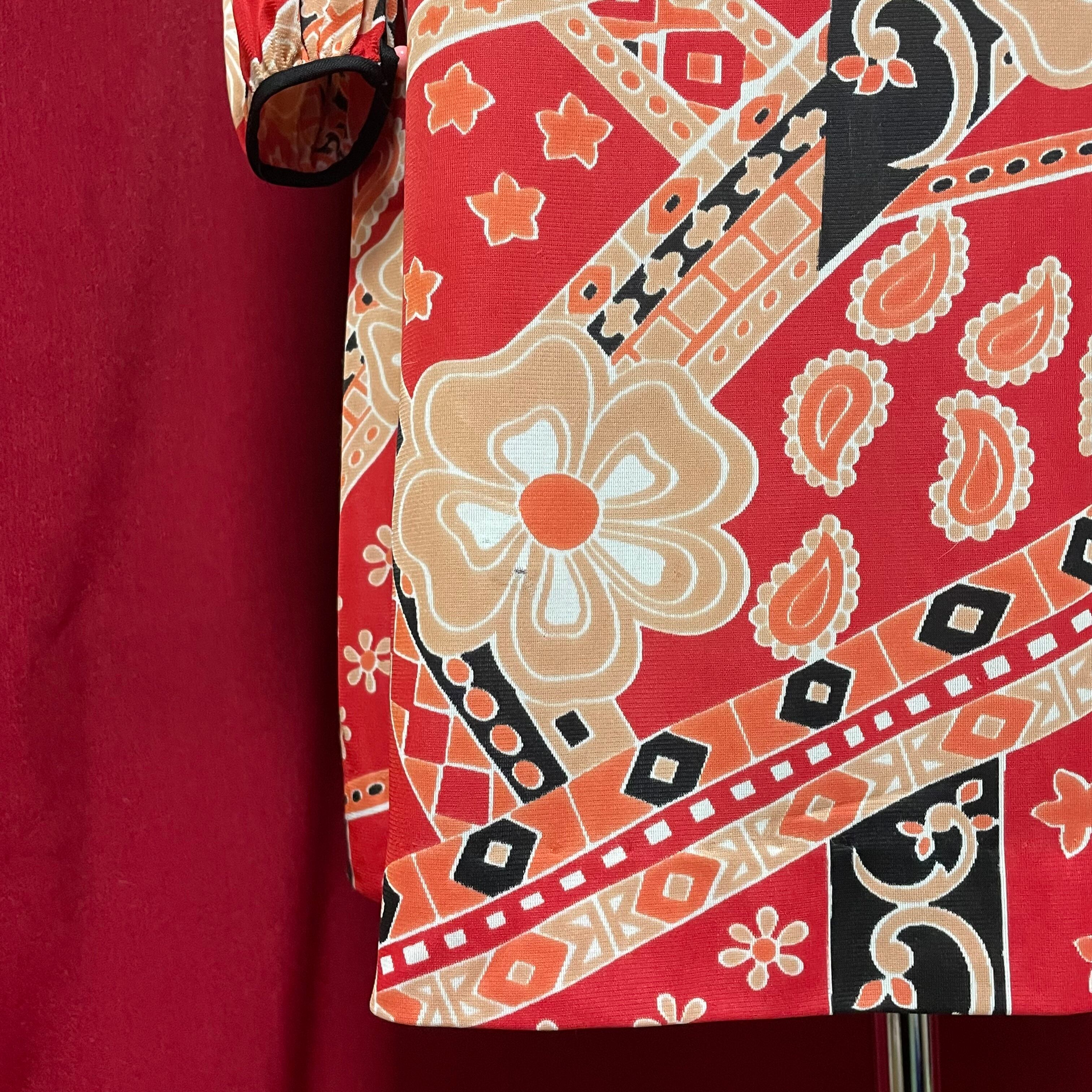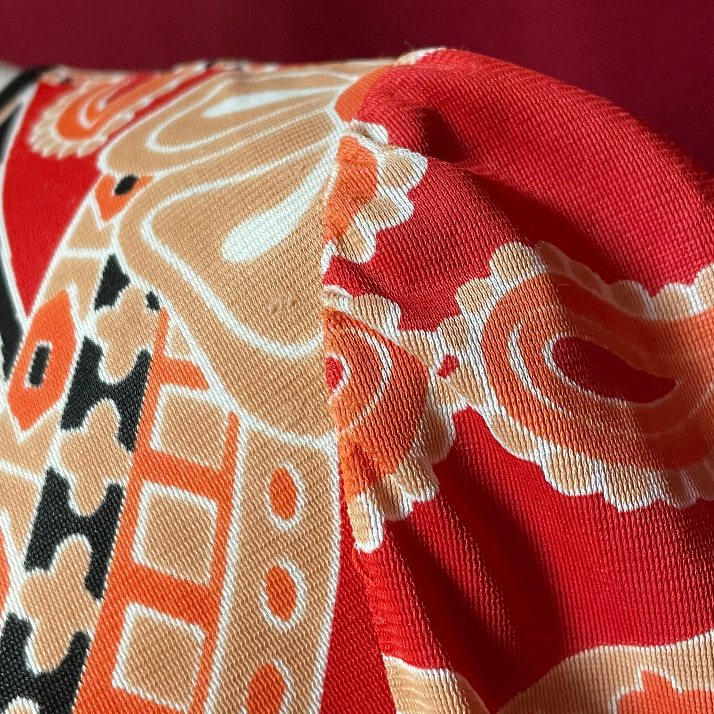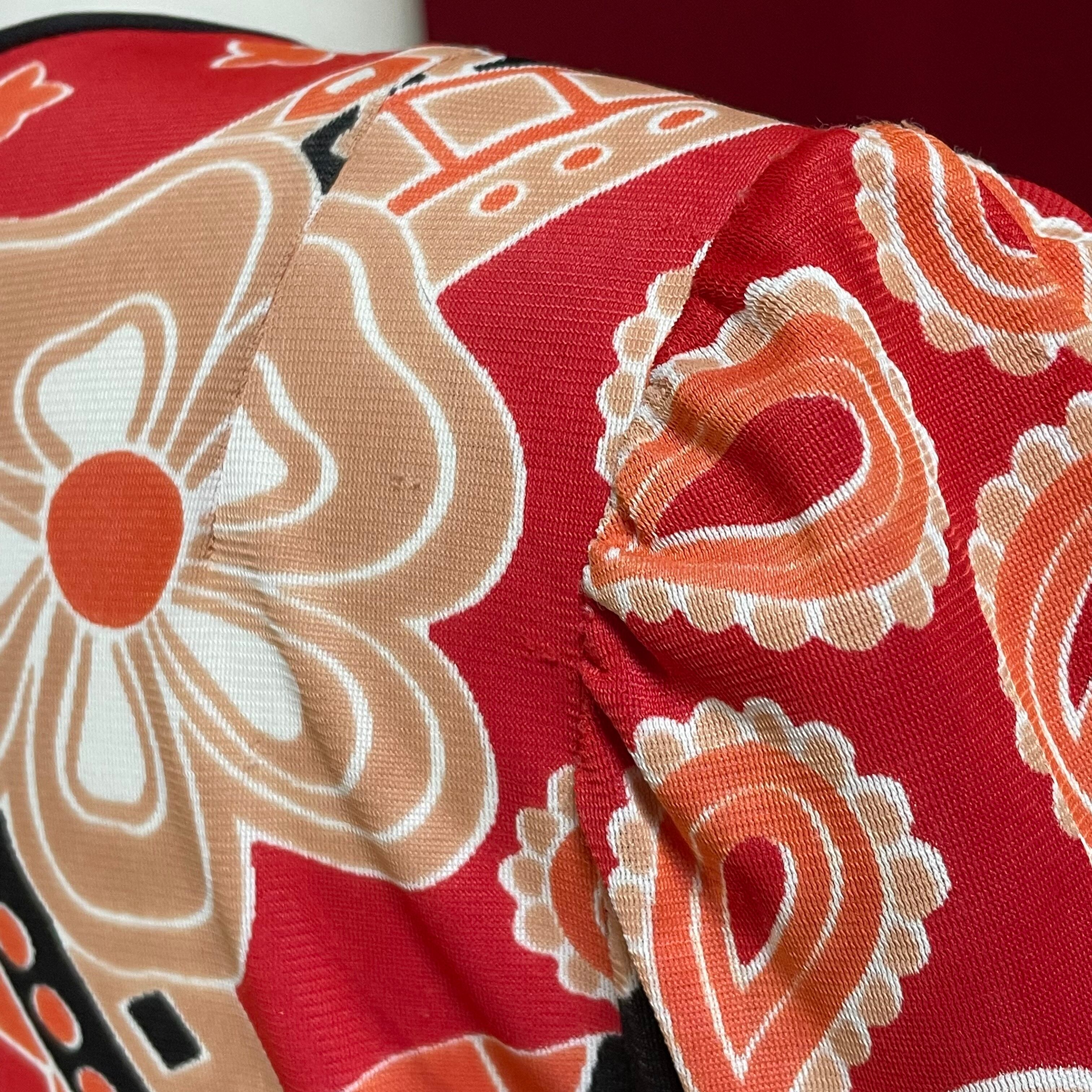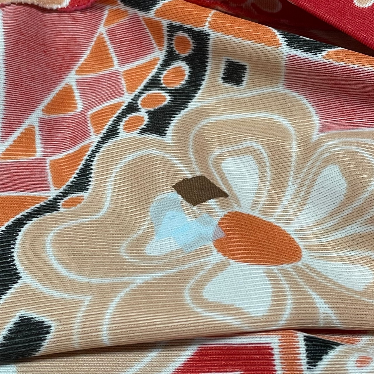 オレンジがかったレッドにオレンジとピンクベージュの花やペイズリーのパターンの