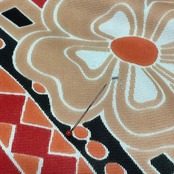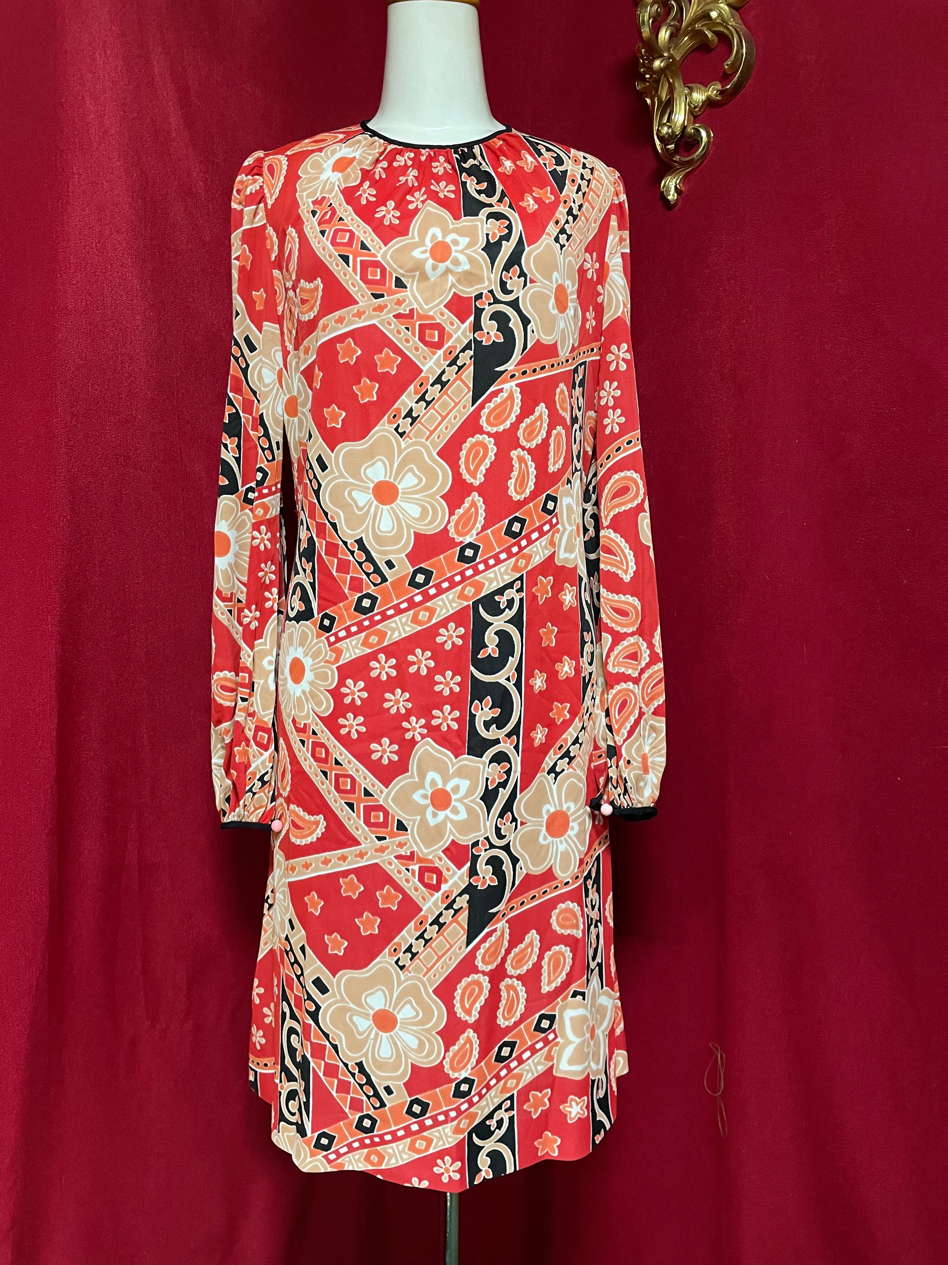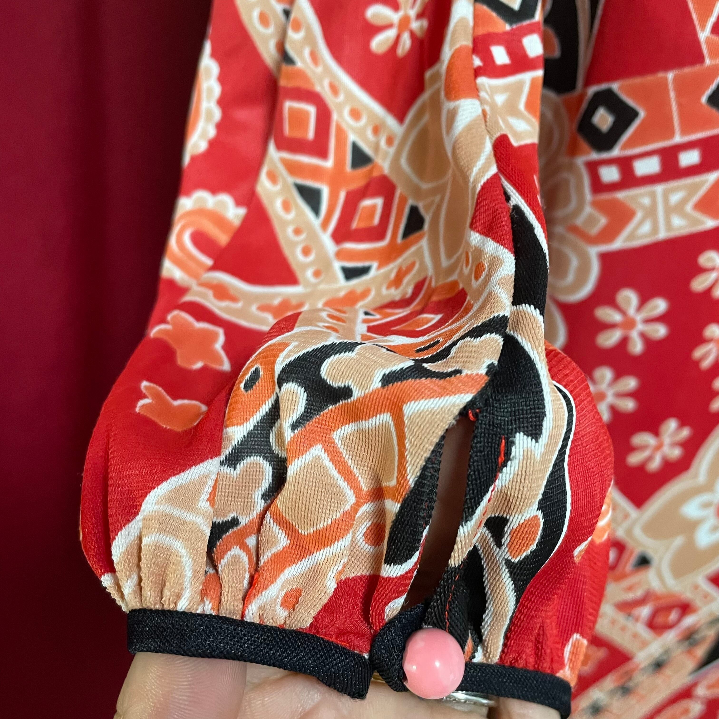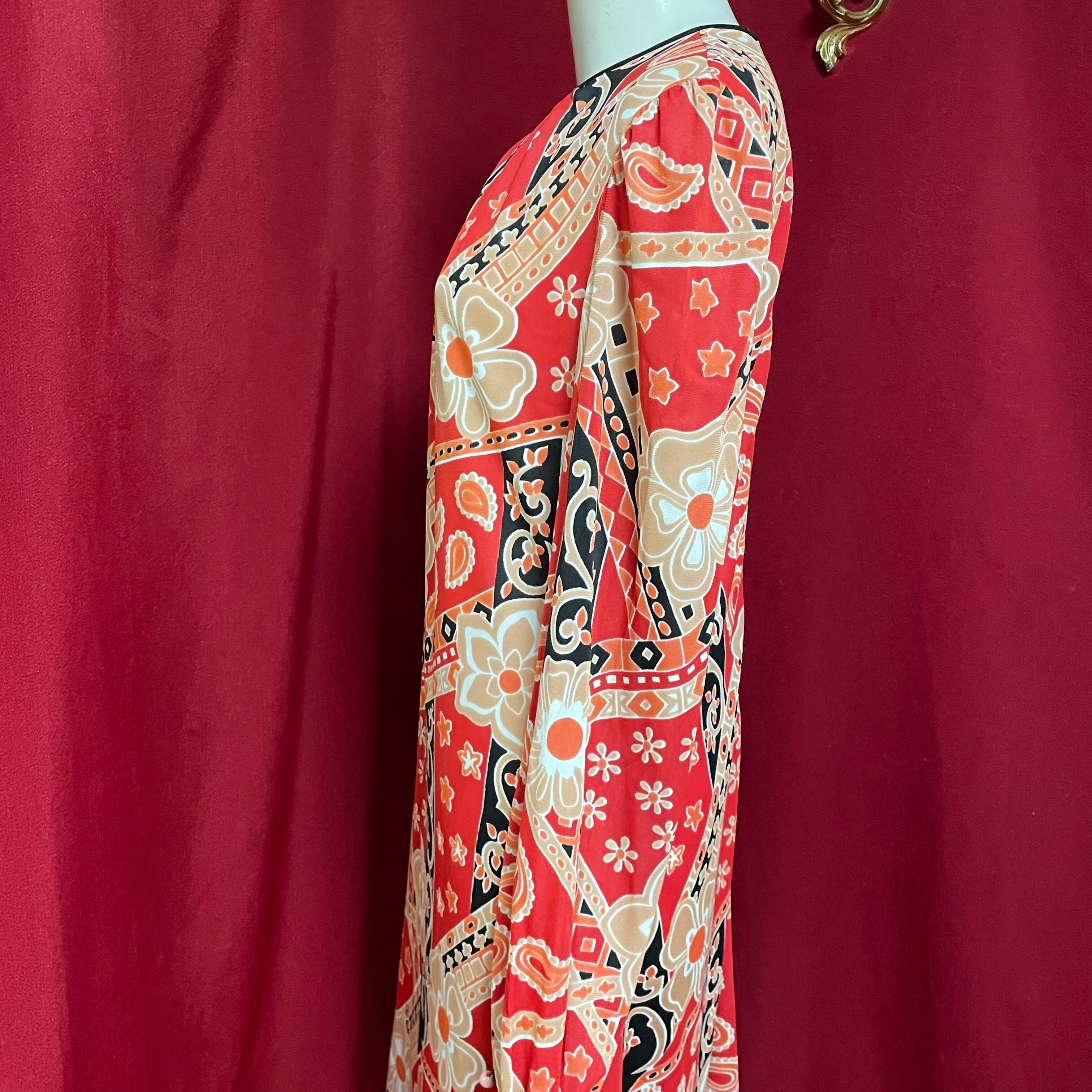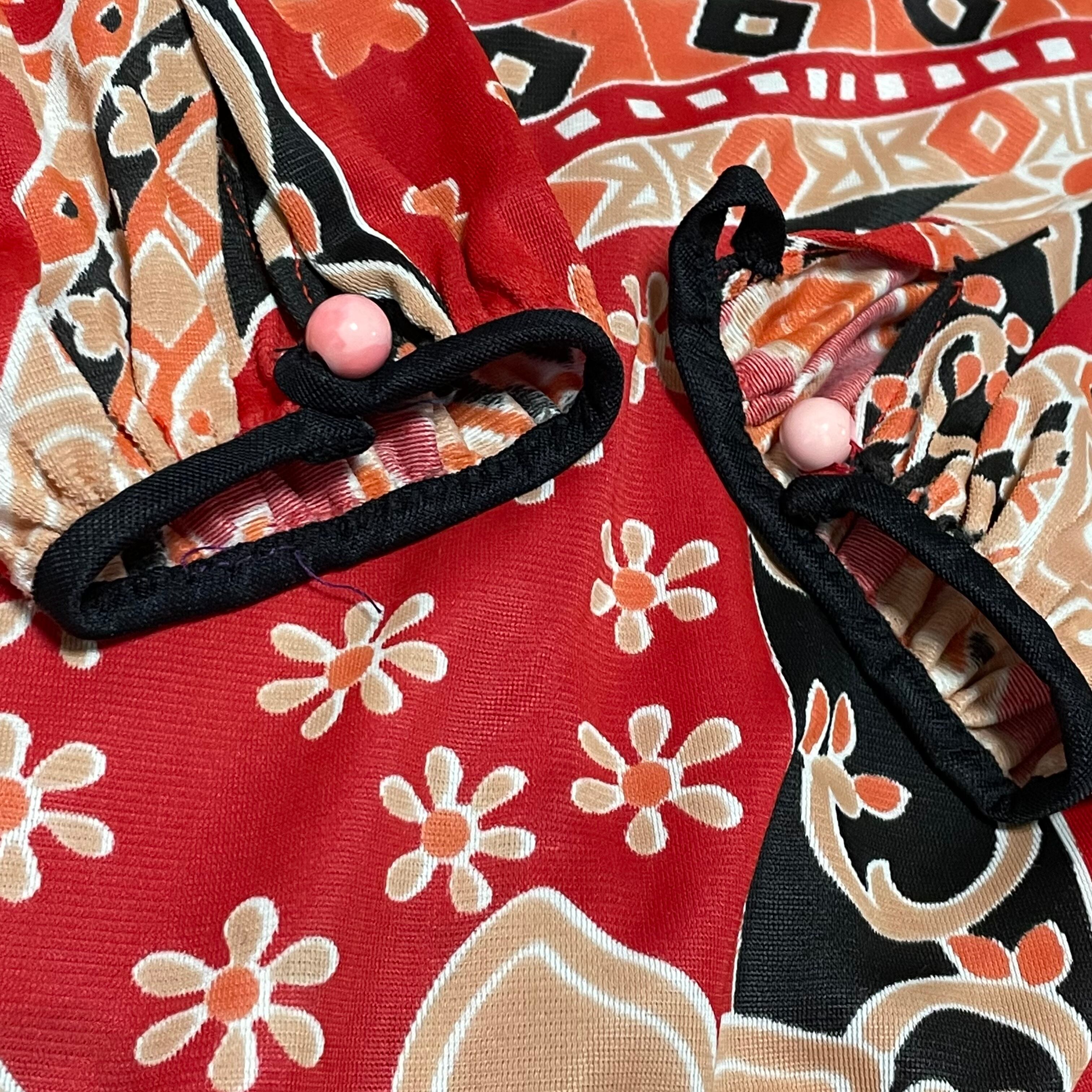 オレンジがかったレッドにオレンジとピンクベージュの花やペイズリーのパターンの