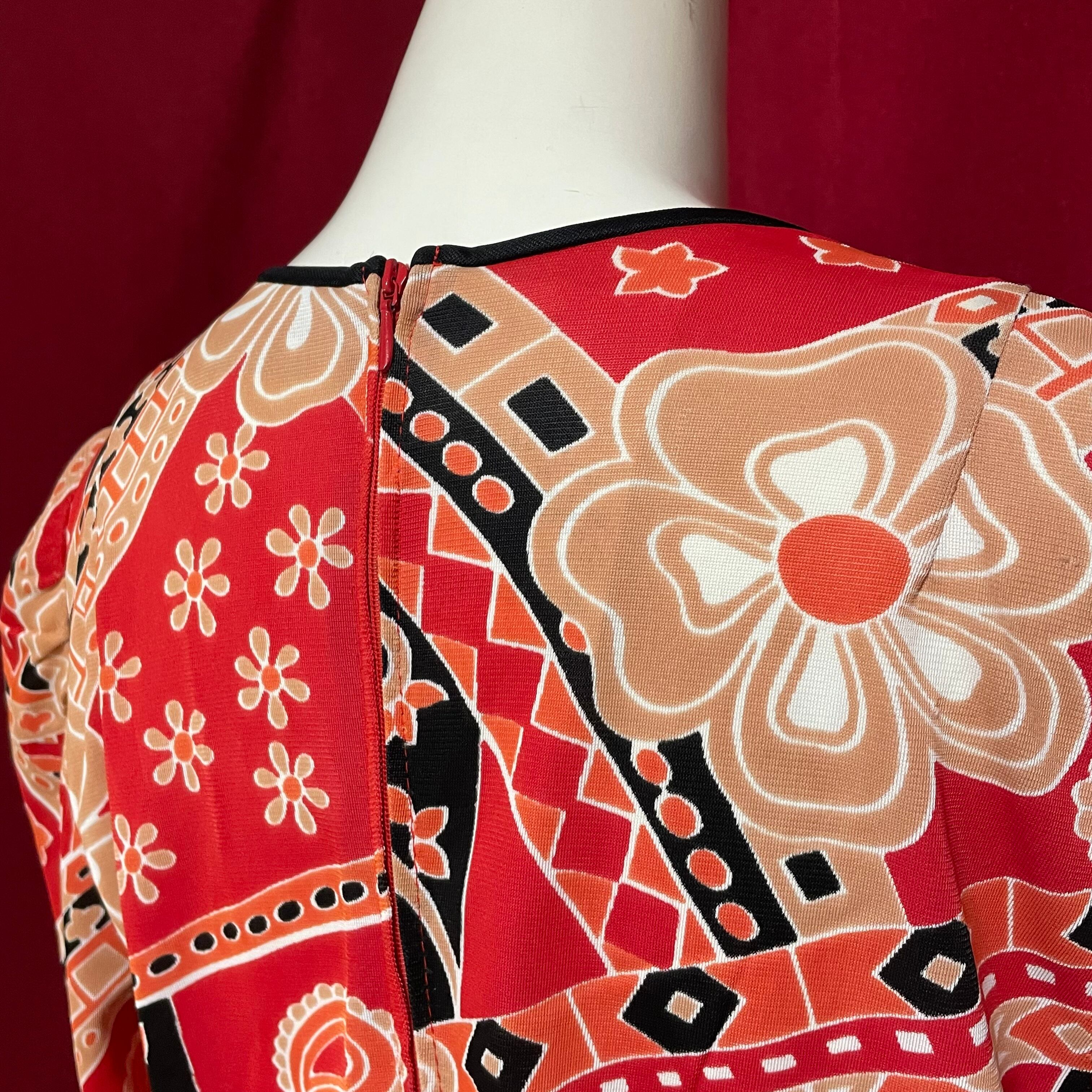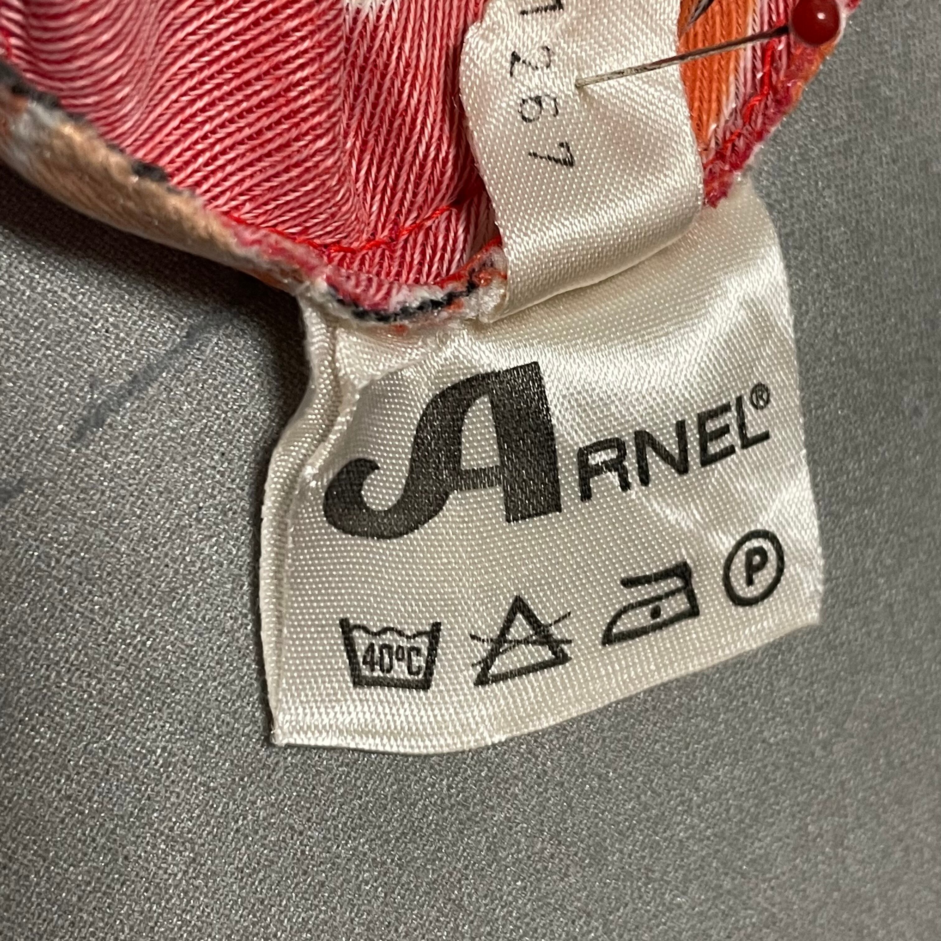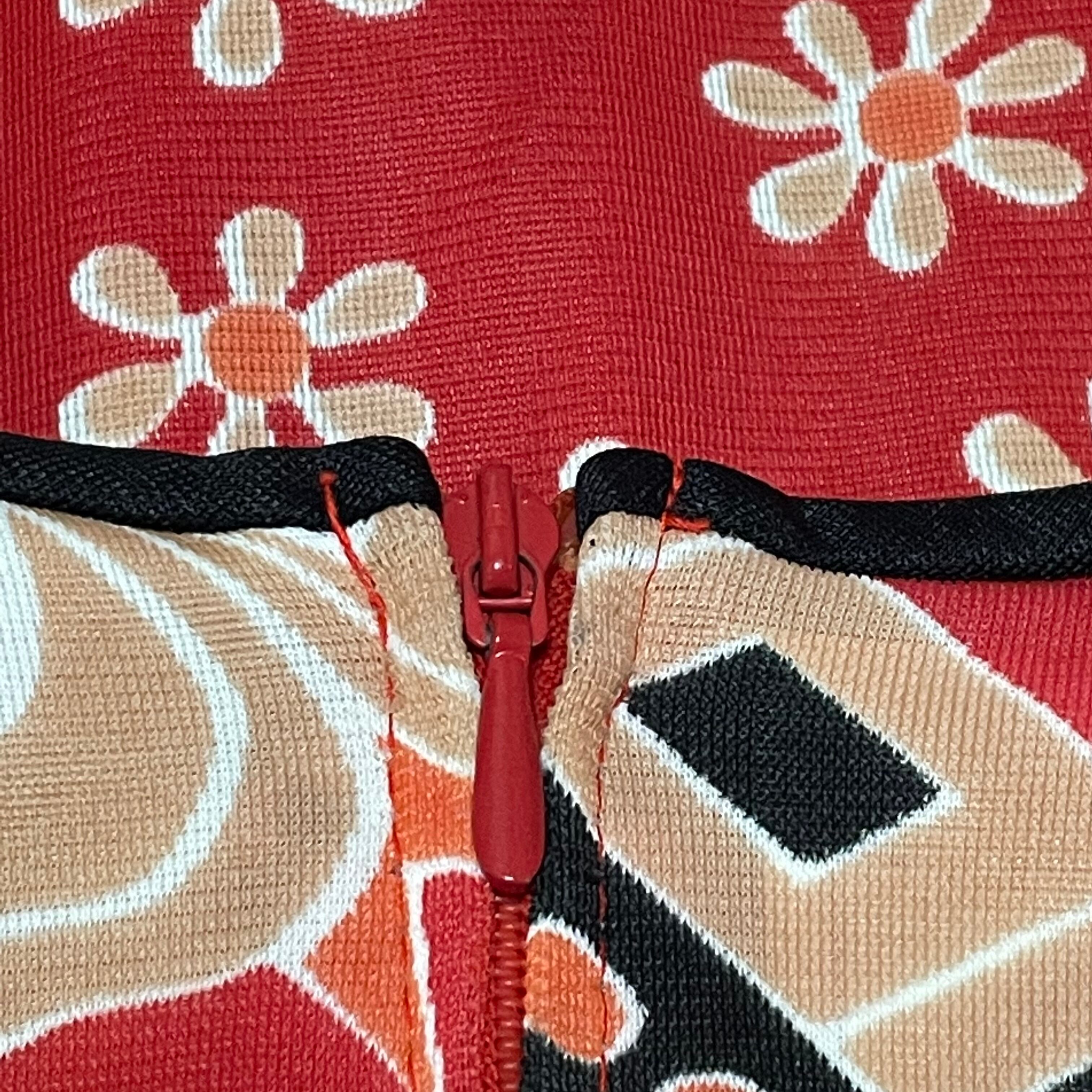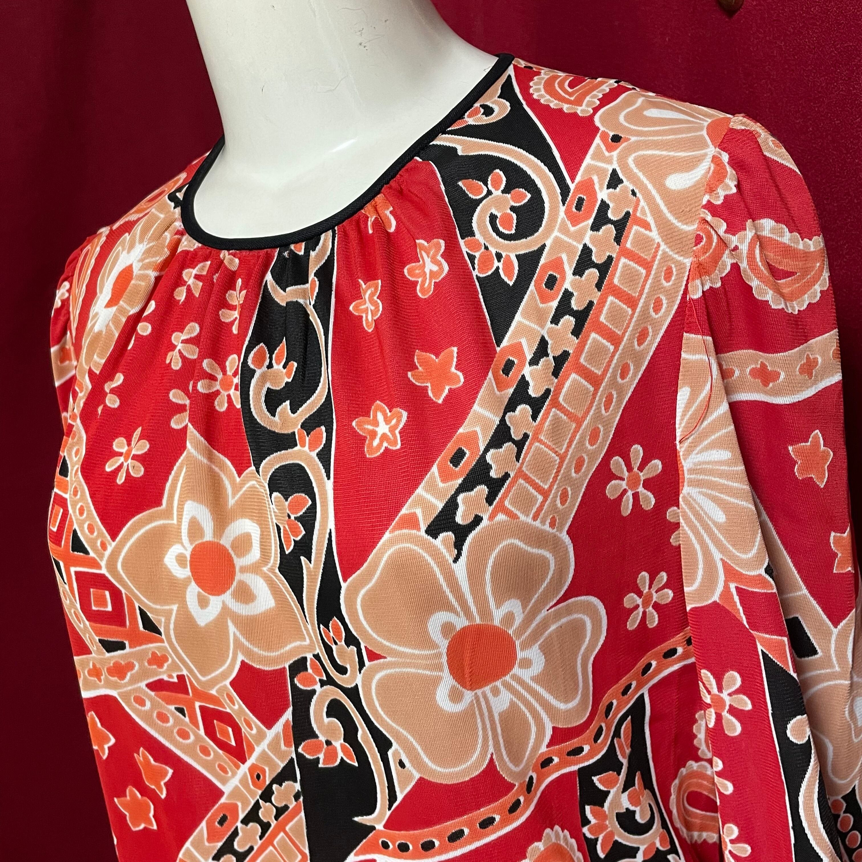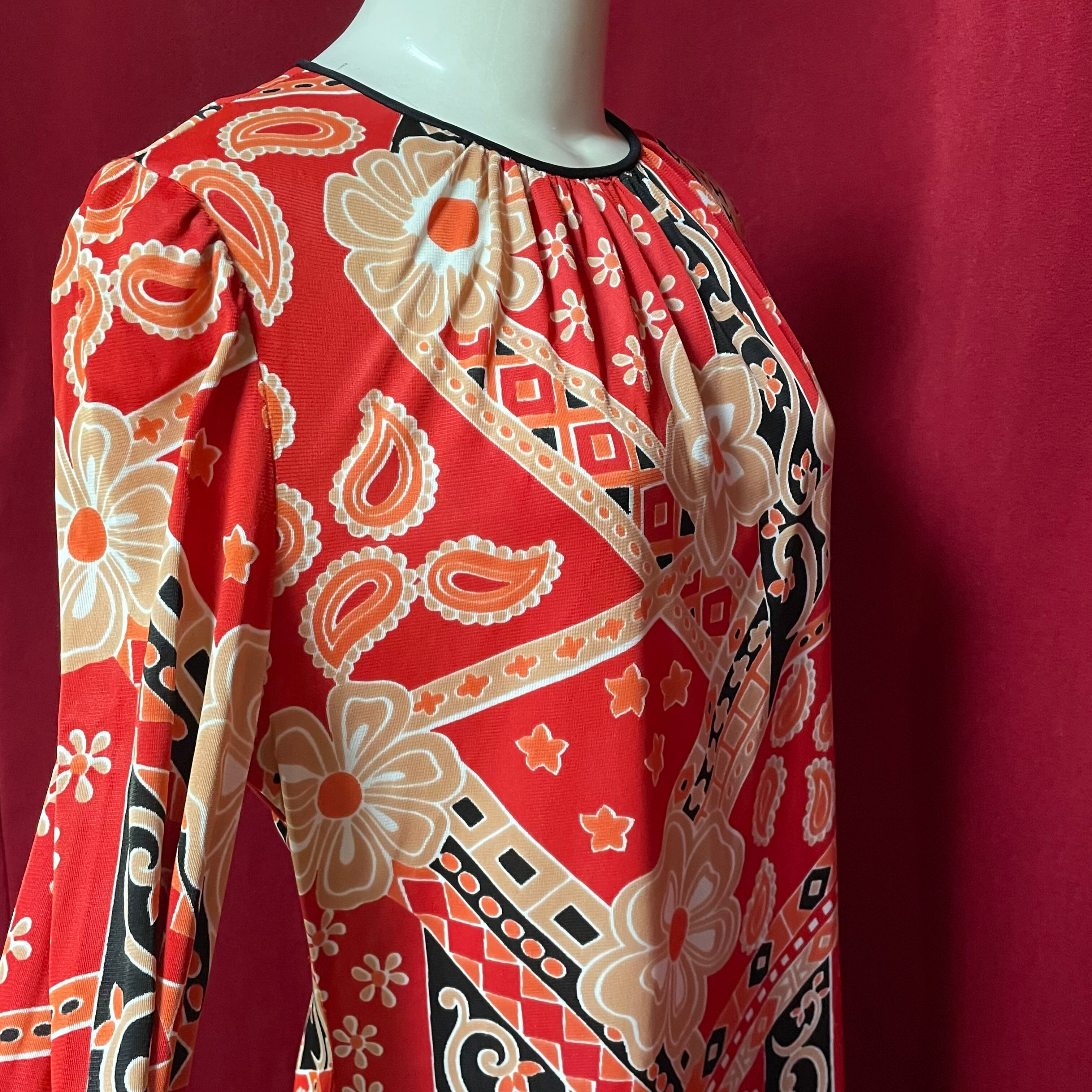オレンジがかったレッドにオレンジとピンクベージュの花やペイズリーのパターンの