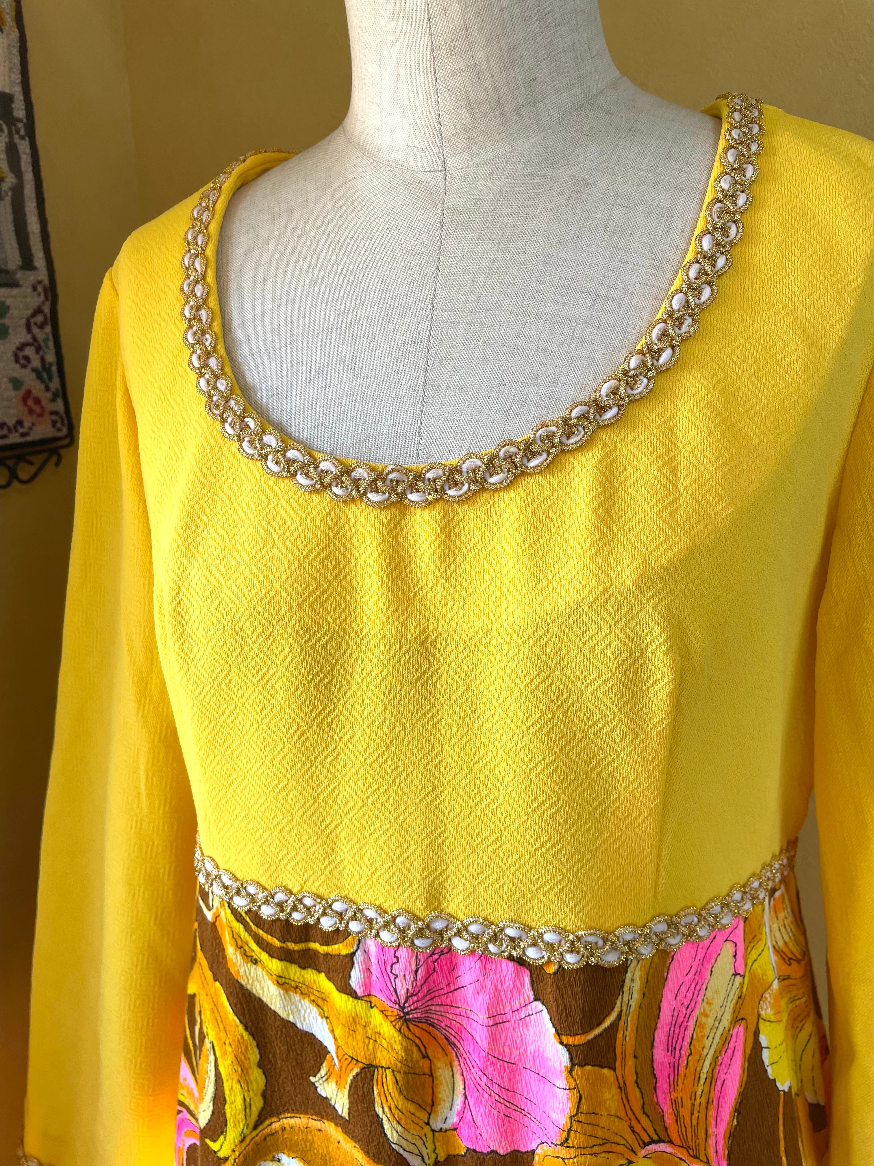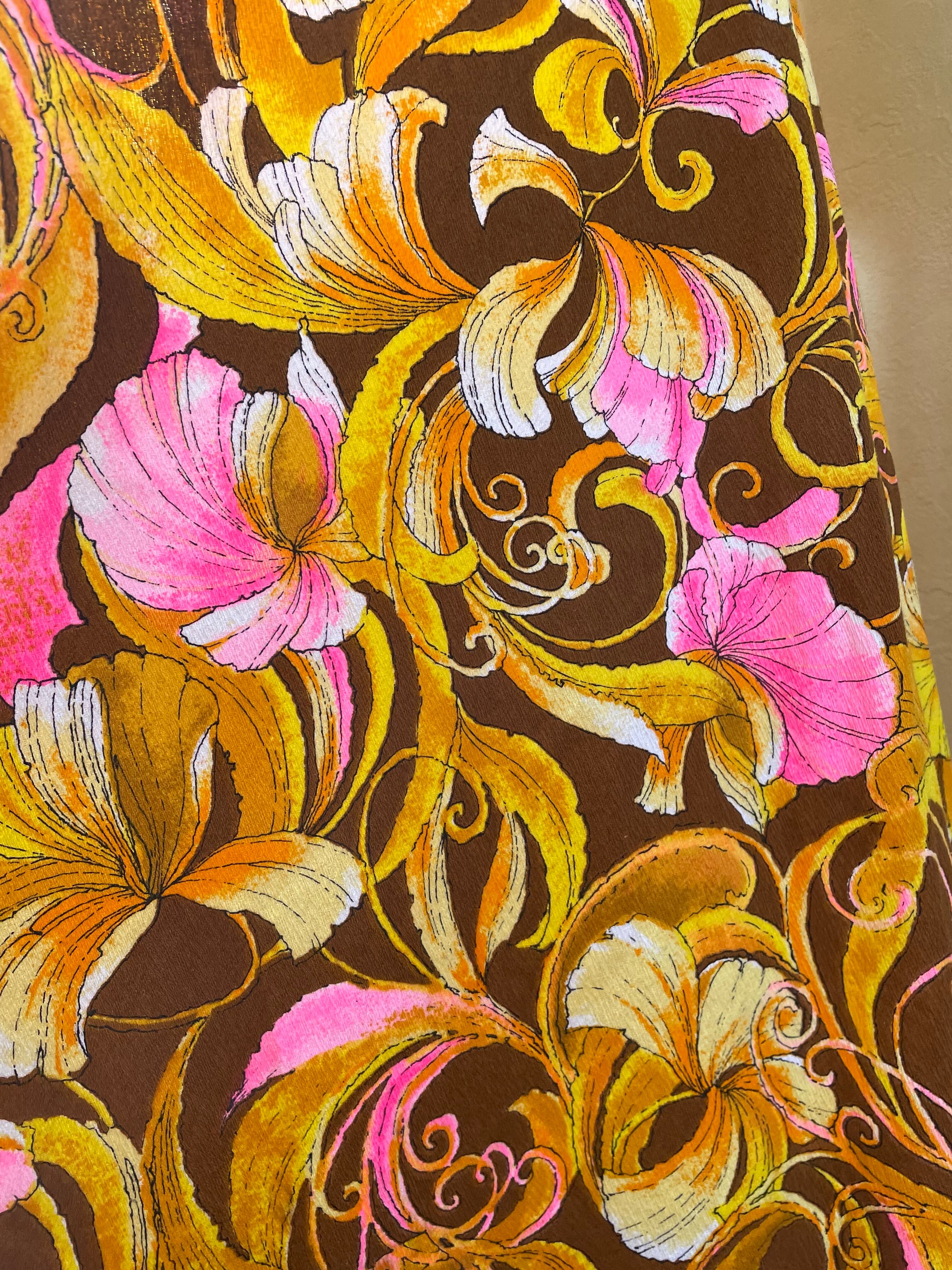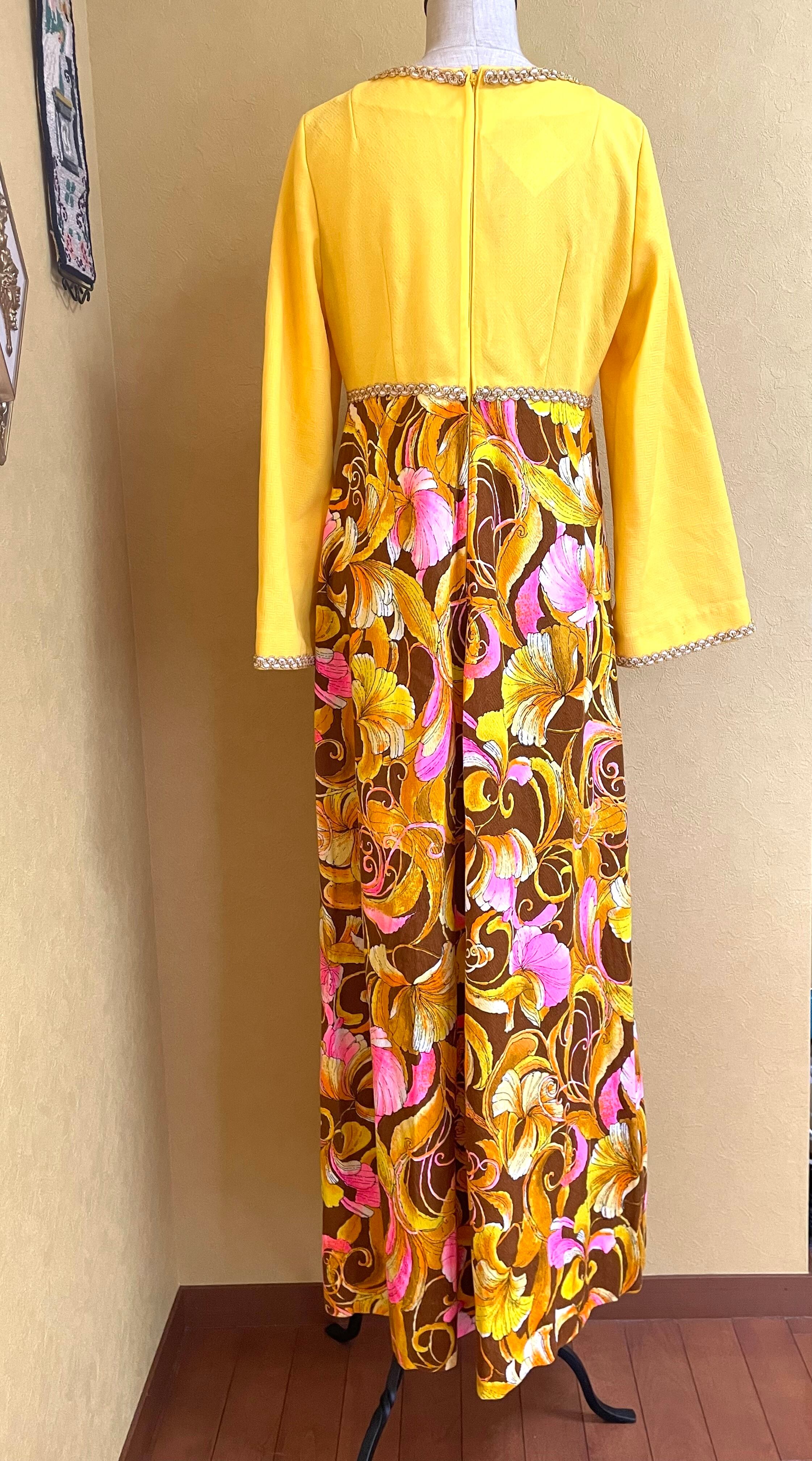 イエローのトップとブラウンベースに渋いイエローとピンクのダイナミックなフラワー柄
