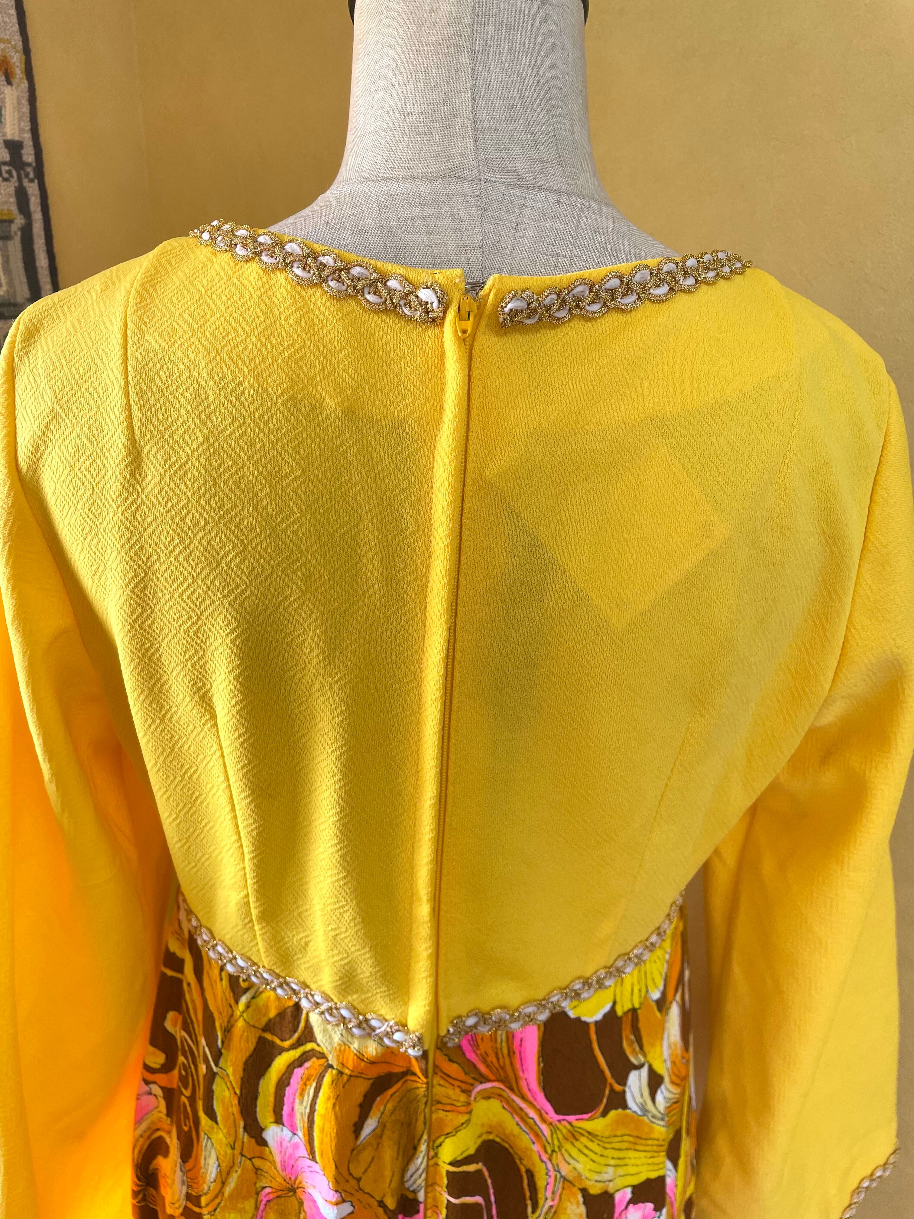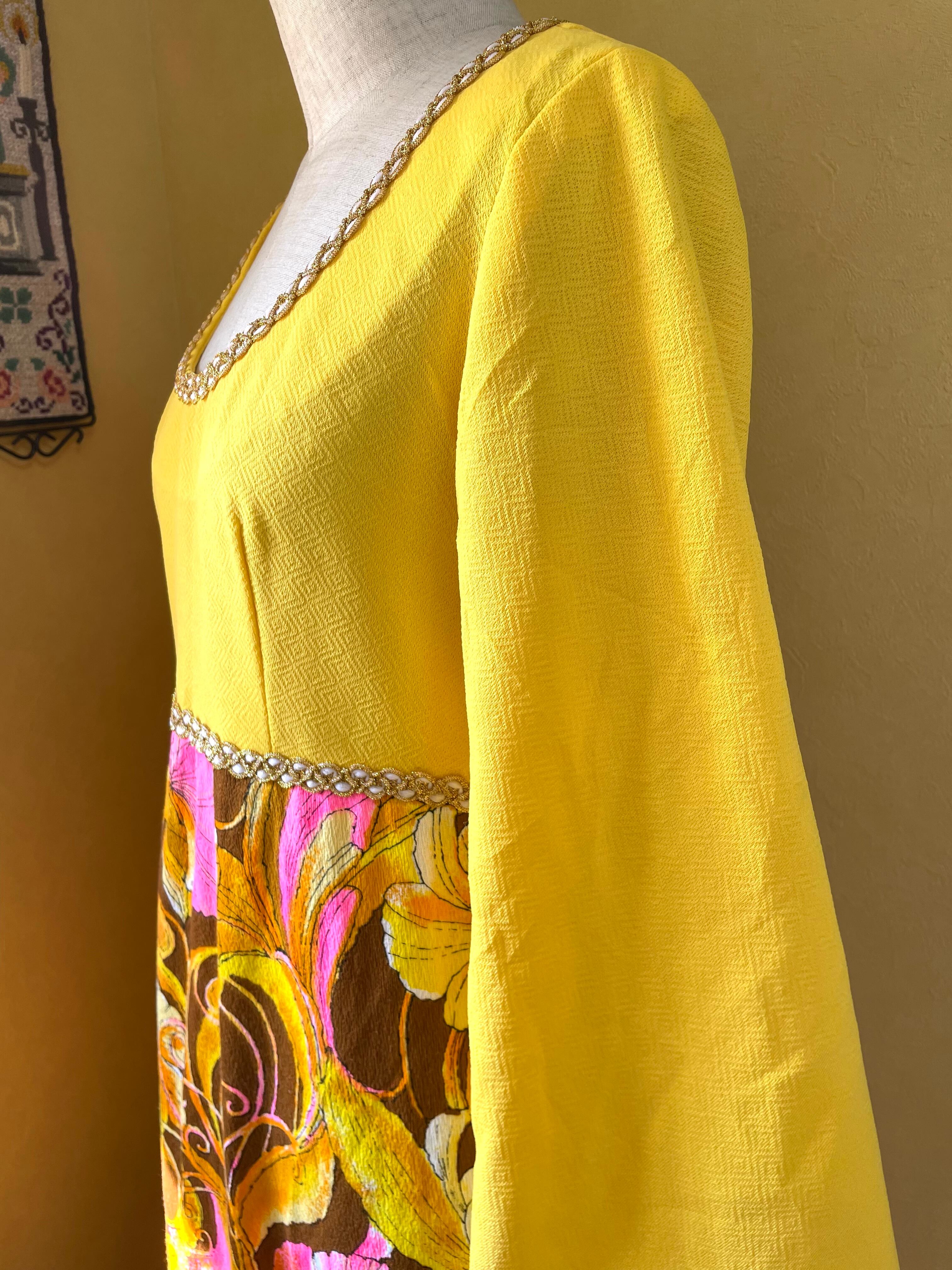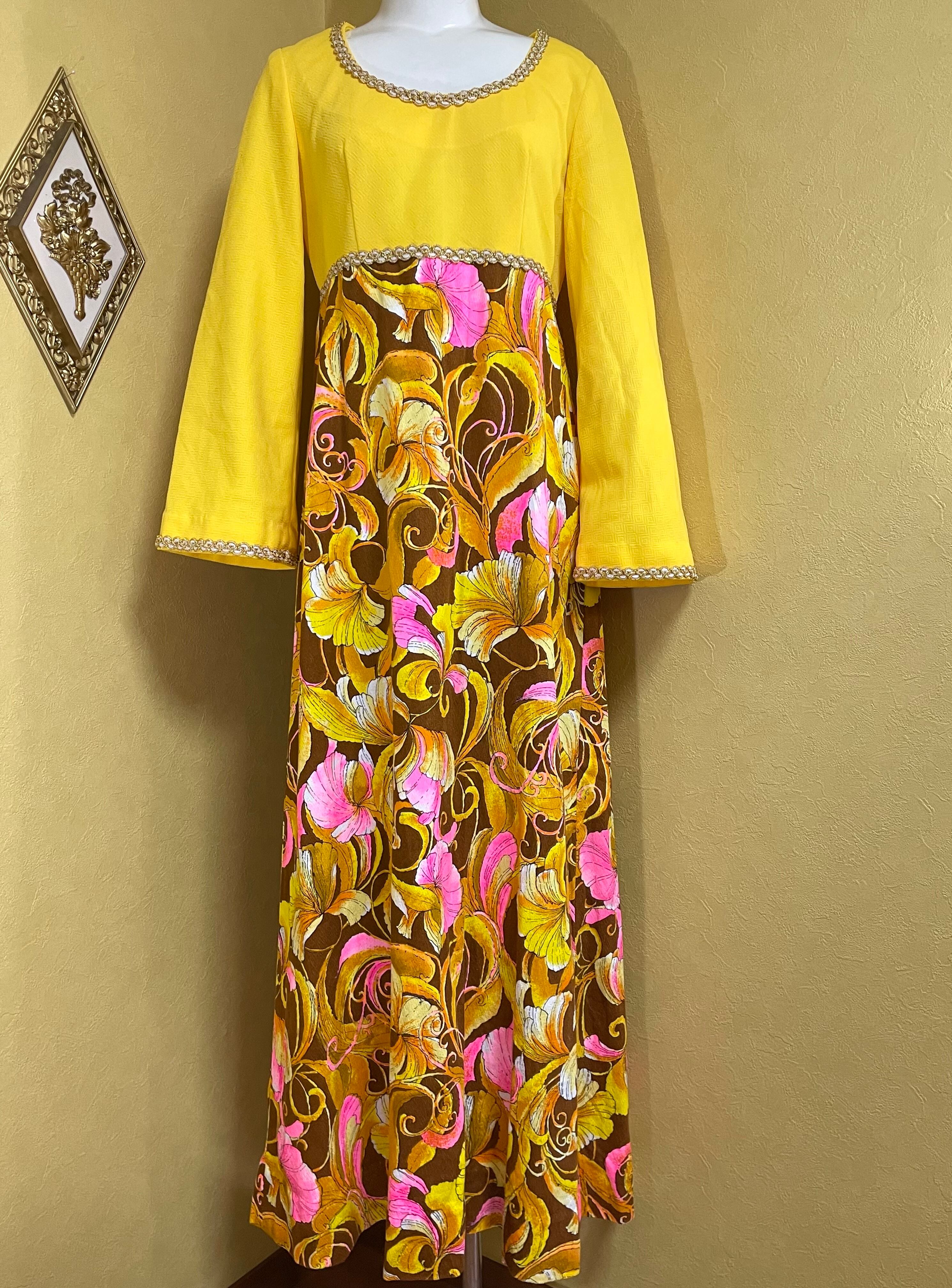 イエローのトップとブラウンベースに渋いイエローとピンクのダイナミックなフラワー柄